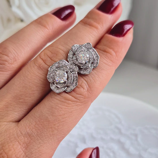 Silver earrings in rose design with moissanite